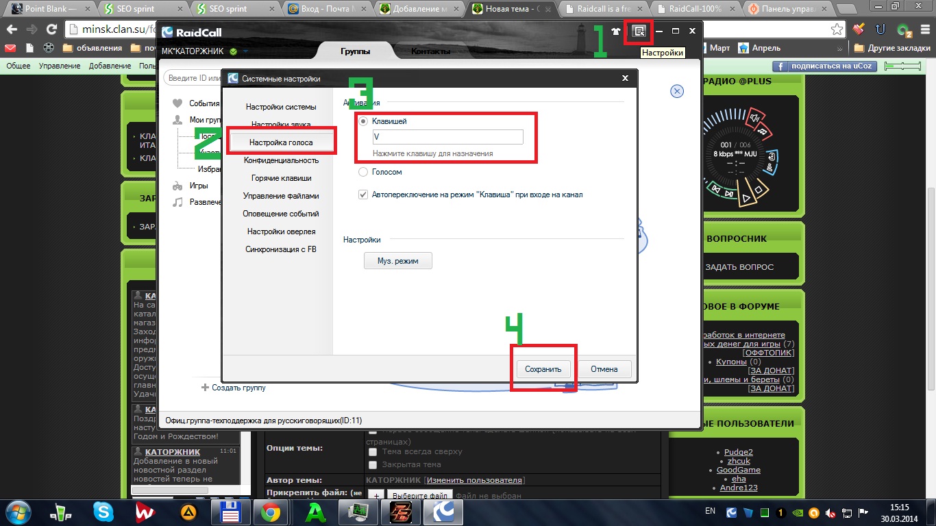 Настроить РК (Raidcall) очень просто. Скачиваем Raidcall (файл чист, вирусов в нём нет). Устанавливаем на свой ПК. Заходим СЮДА и регистрируем свою учётную запись в системе Raidcall. После регистрации запускаем Raidcall и залогиниваемся в программе. После входа вводим ID нашего канала вот СЮДА. В канале есть "Гостинная" в которую могут войти все и 2 канала "Синие" и "Красные". На каналах установлен пароль: 555777. Настраиваем программу в соответствии своим требованиям. Обязательно устанавливаем управление звуком по нажатии клавиши (чтобы программа работала как рация выполняем интуитивно понятные действия по цифрам от 1 до 4, указанным на скриншоте, при этом кнопка ответа может быть любой, удобной для вас а не "V", которая фигурирует на скриншоте). После выполнения всех вышеуказанных действий вы можете начинать пользоваться программой.